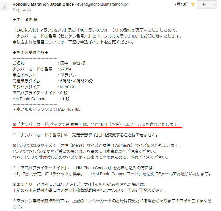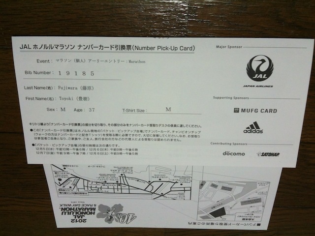 ホノルルマラソンのゼッケンの引換票はいつ届く?