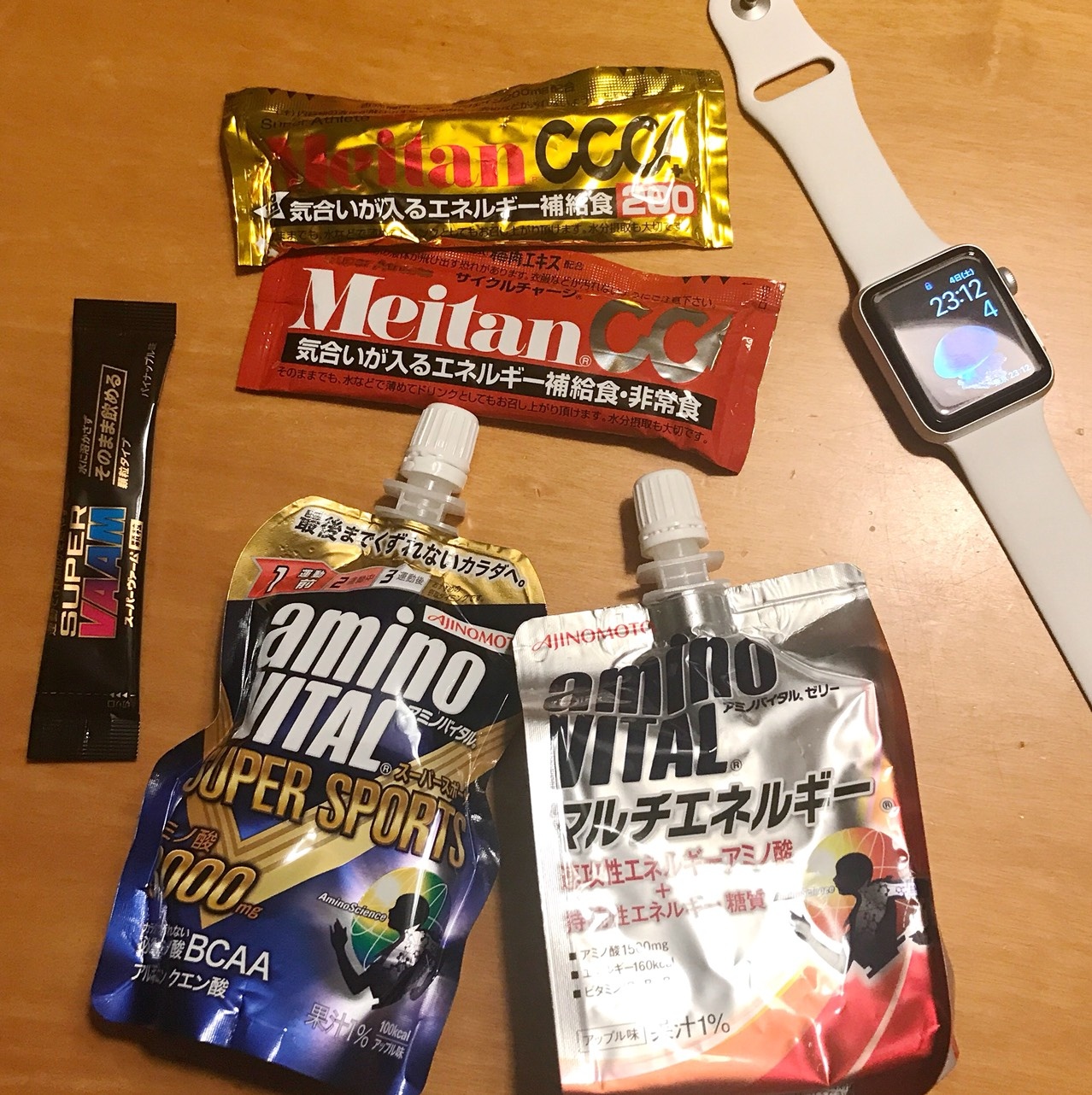 僕はこの日の朝、軽くて消化のいいもの、ということで写真にあるアミノバイタルとゼリー飲料を飲んでスタートしました。
