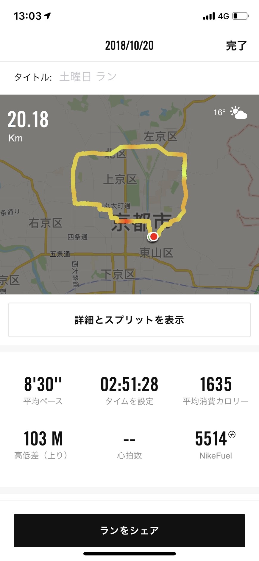 はい、もちろんこんなグーグルマップほど最短距離では走っていませんが、ざっくりでNIKEのアプリでいうと20キロ程度でした。